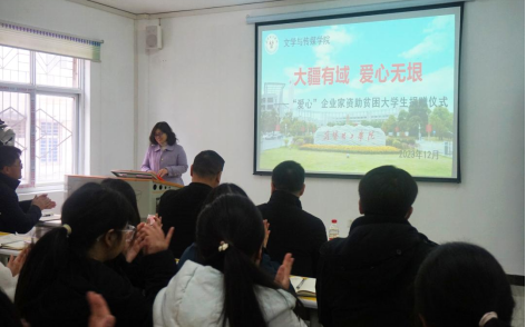 裴文倩书记发表致辞,她对企业家们的善举表示感谢,并强调了本次资助对于促进育人工作的重要意义。她还号召受资助学生传承优秀企业家的这份责任与担当精神,用知识改变命运,用成绩回报社会。