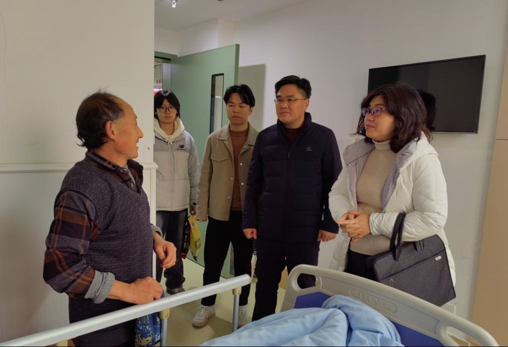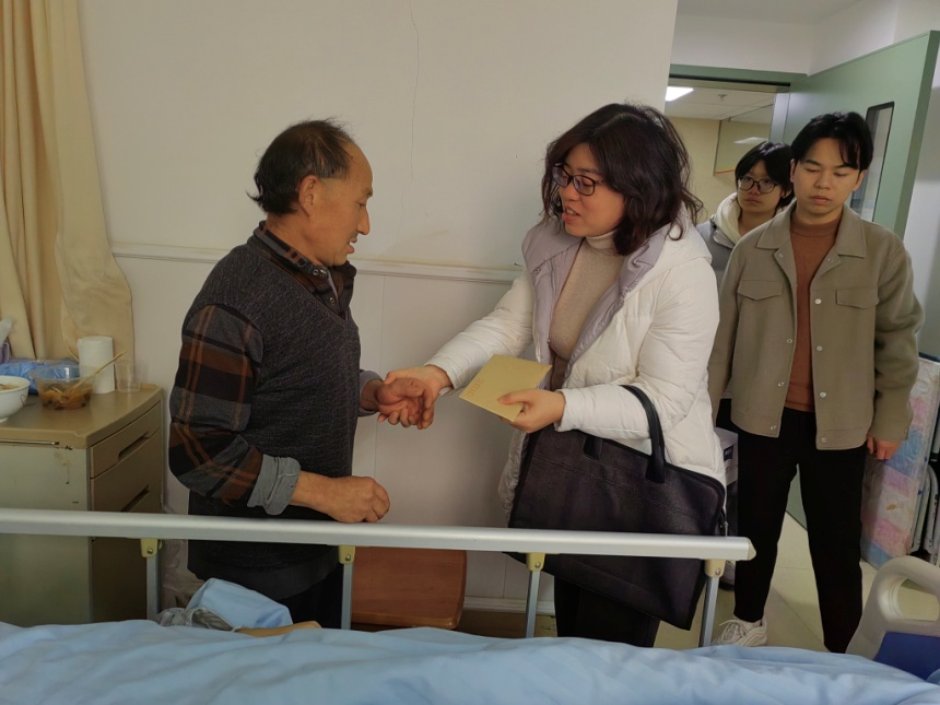 隆冬透寒意,慰问暖人心。12月26日上午,QY千亿球友会党总支书记裴文倩、副书记刘清华、学工办主任杨金宝、辅导员覃菁菁及学生干部郝春雨一行5人前往荆门市人民医院探望正在接受治疗的2022级网络与新媒体1班的陈伟同学,亲手将学院募集到的爱心善款送至学生家长手中,向学生和家长表示慰问和关心。