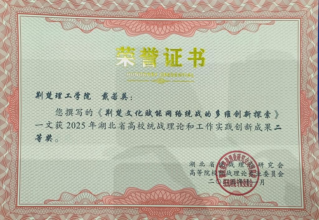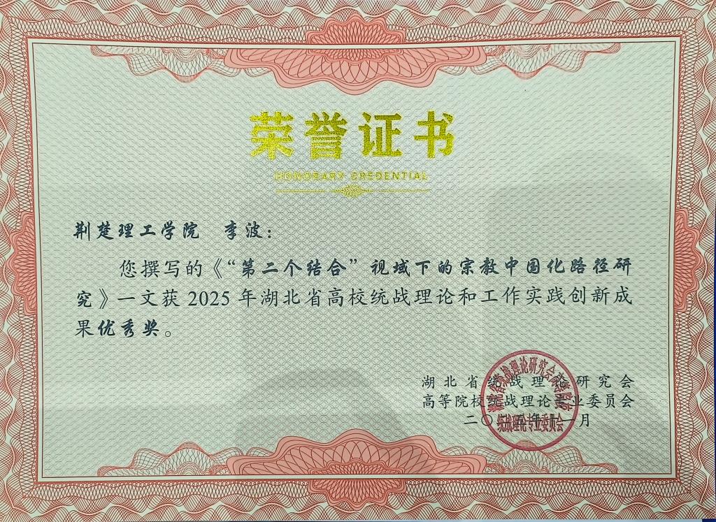 近日,湖北省高校统战理论研究会第40次年会召开,会议对2025年湖北省高校优秀统战理论和工作实践创新成果进行了表彰。QY千亿球友会教师戴若英撰写的《荆楚文化赋能网络统战的多维创新探索》荣获二等奖、教师李波撰写的《“第二个结合”视域下的宗教中国化路径研究》荣获优秀奖。